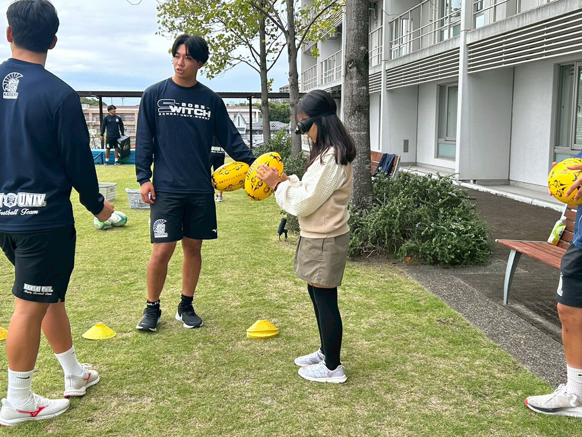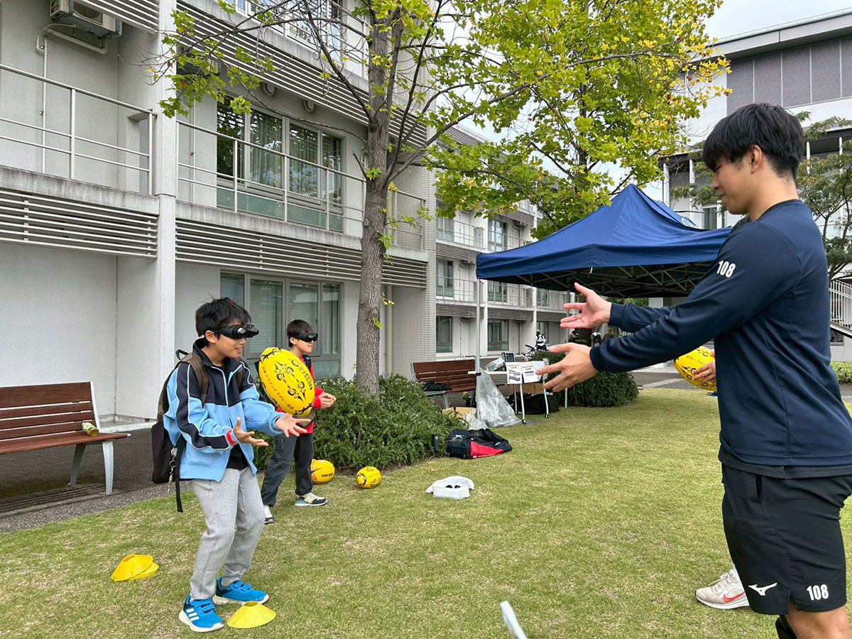 関大みらい〜ねフェスタにて、関大ラグビー部の方々と一緒にブラインドラグビー体験ブースを出展しました。 100名ほどに体験していただきました。 パス、的当ての体験をしていただきました。 特に地域の子どもたちの参加が多く、ブラインドラグビーを知っていただく良い機会となりました。